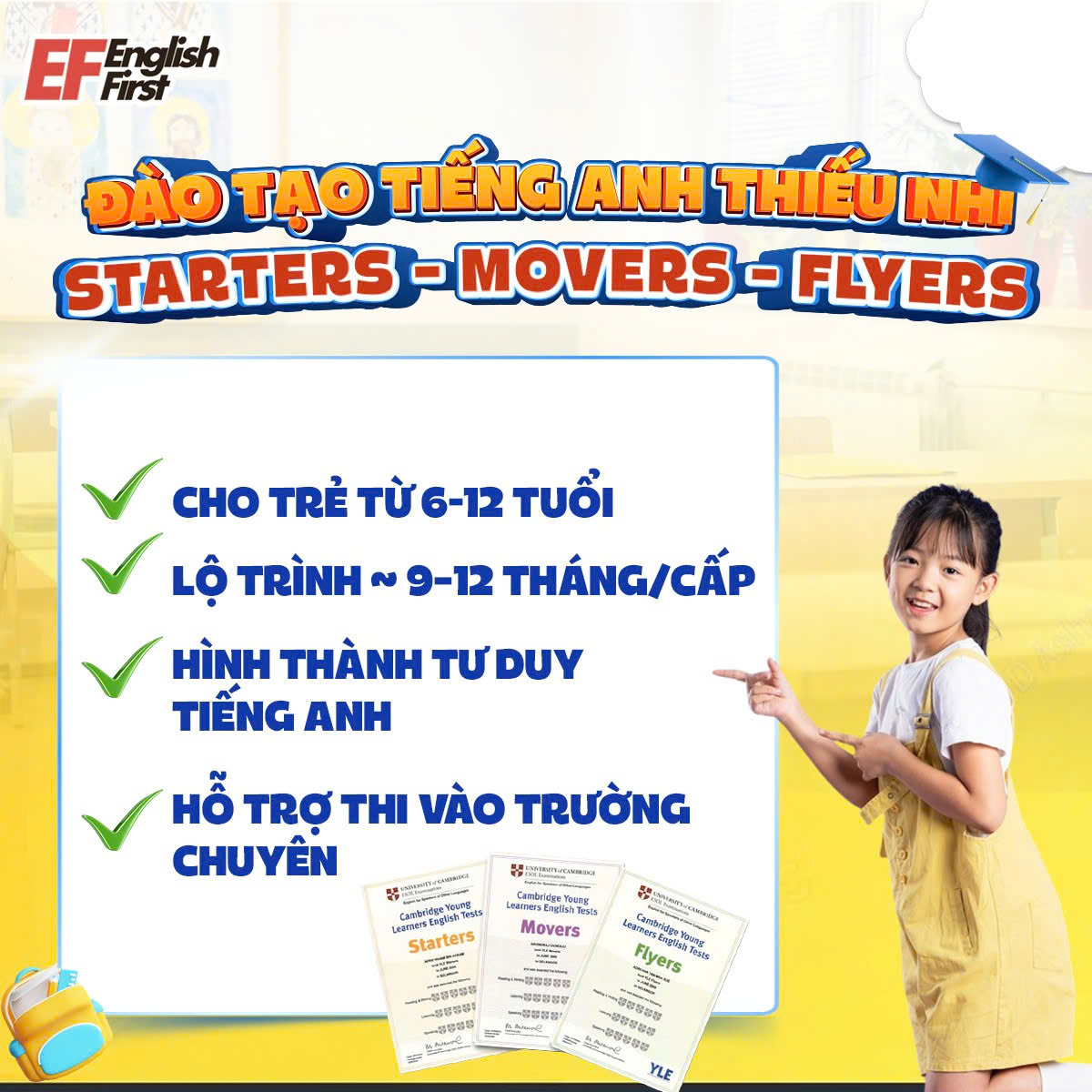 Tại English First, học viên được học theo chương trình bám sát định dạng bài thi quốc tế Cambridge. Chúng tôi áp dụng khung tham chiếu trình độ ngôn ngữ chung Châu Âu (CEFR) để đo lường tiến bộ của từng học viên, đảm bảo kết quả học tập không chỉ phù hợp với yêu cầu thi cử mà còn vững chắc cho giao tiếp thực tế. Với lộ trình rõ ràng, phụ huynh và học viên có thể theo dõi quá trình học và đạt được mục tiêu mong muốn một cách minh bạch.